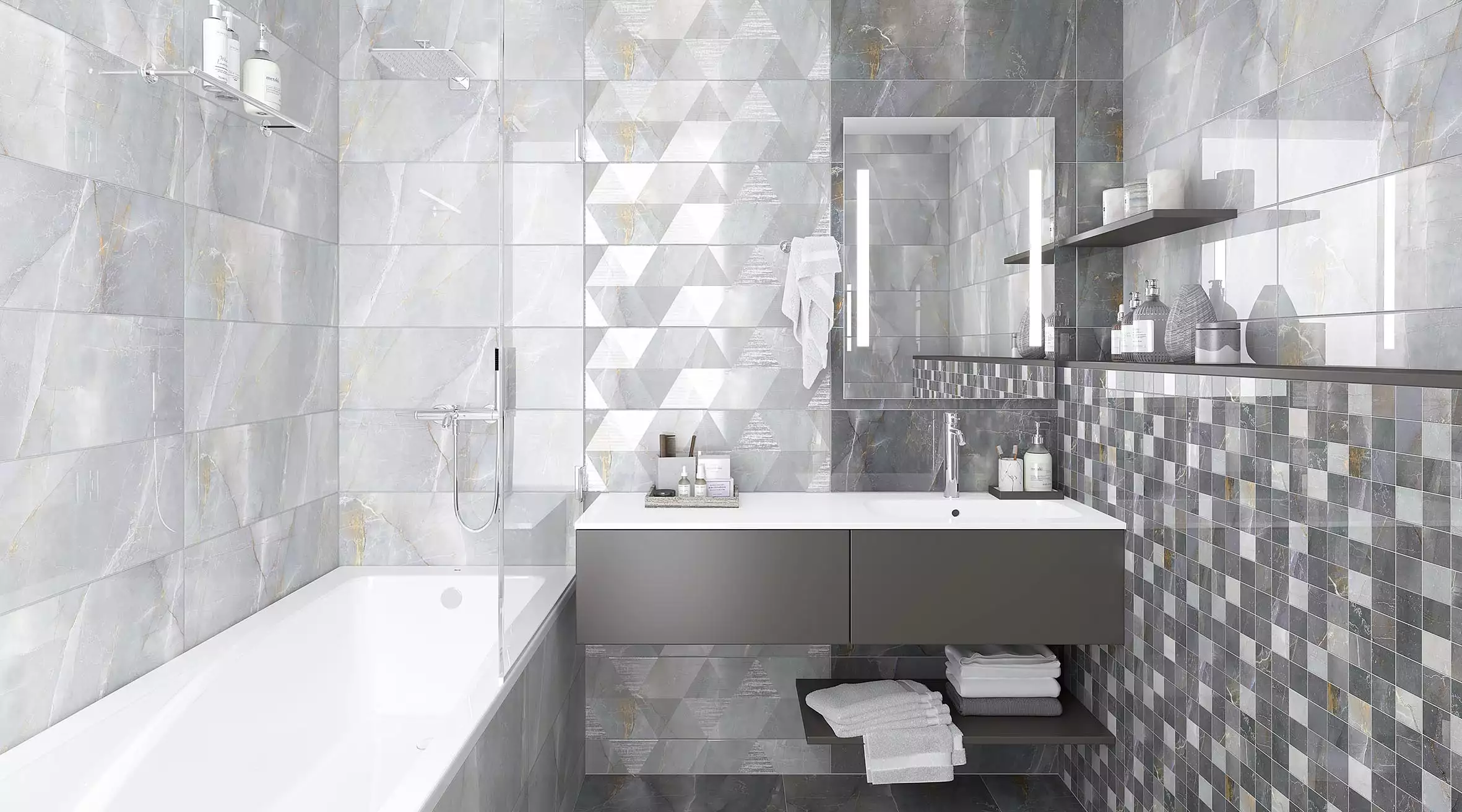 Галерея интерьеров, фото различных вариантов оформления помещений с плиткой из коллекции Shade от штатных декораторов фабрики Laparet. Дизайнеры VERONACERAMIC.RU помогут вам создать свой уникальный дизайн: или другой, используя позиции из Laparet Shade. 3D проект изготавливается бесплатно в течении 2-х рабочих дней.